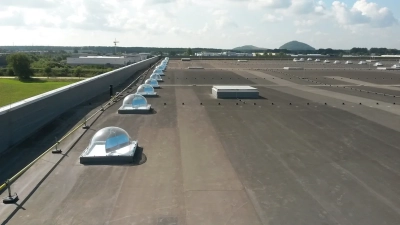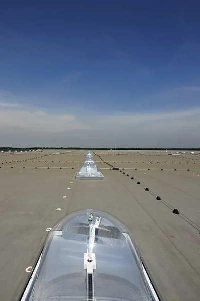 The walls were given an insulation layer of 10 cm, the roof of 15 cm. That is good for an E-level of 18, comparable to passive houses. As a result, the entire building will be kept at temperature with only 12 heaters. The Lightcatchers illuminate the aisles with a minimum of roof openings, thus maintaining the good insulation value. A total of 140 Lightcatchers were provided, representing only 237 m² or 0.6% of the total roof area.